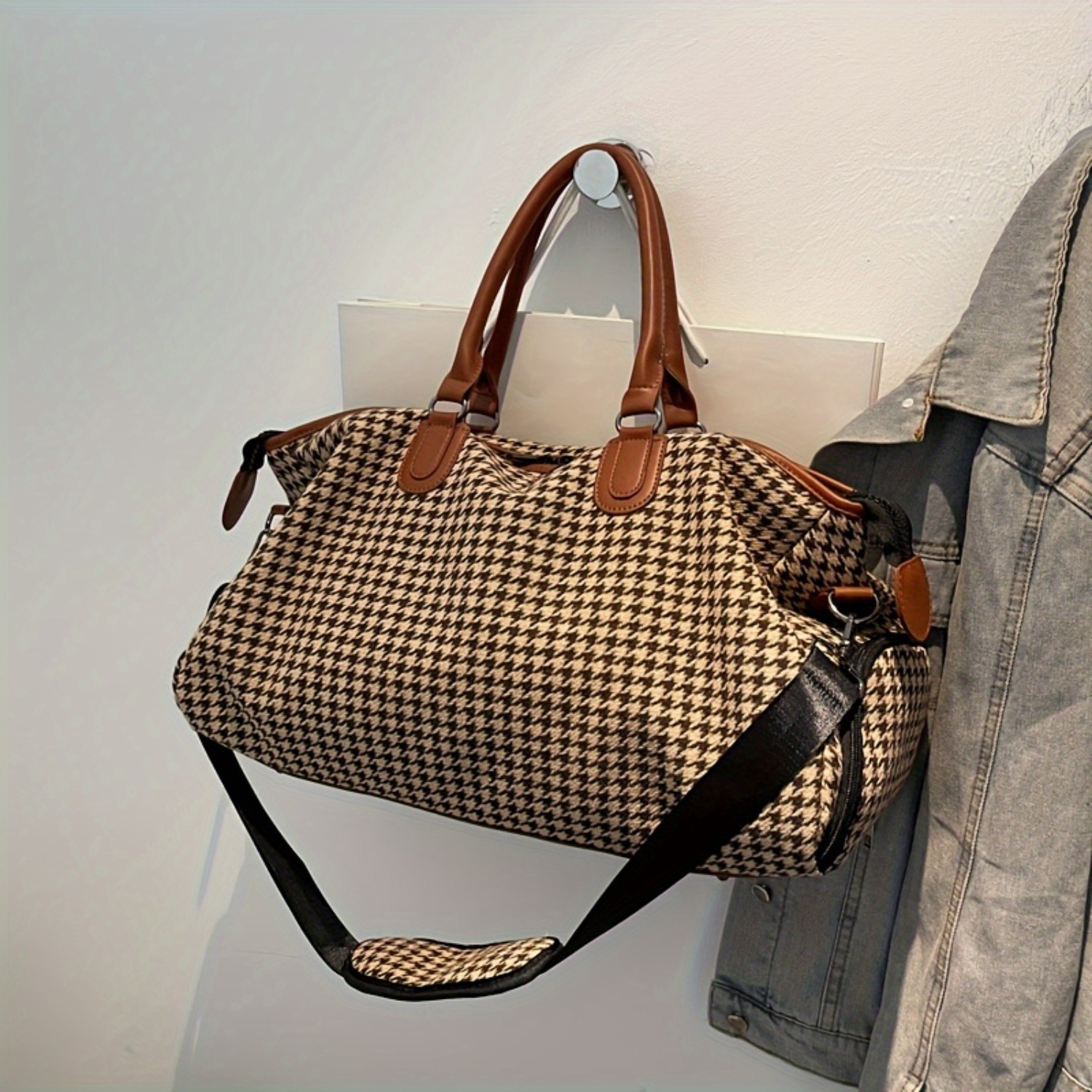 Large Capacity Houndstooth Pattern Sports Bag, Versatile Travel Luggage Handbag, Trendy Overnight Bag