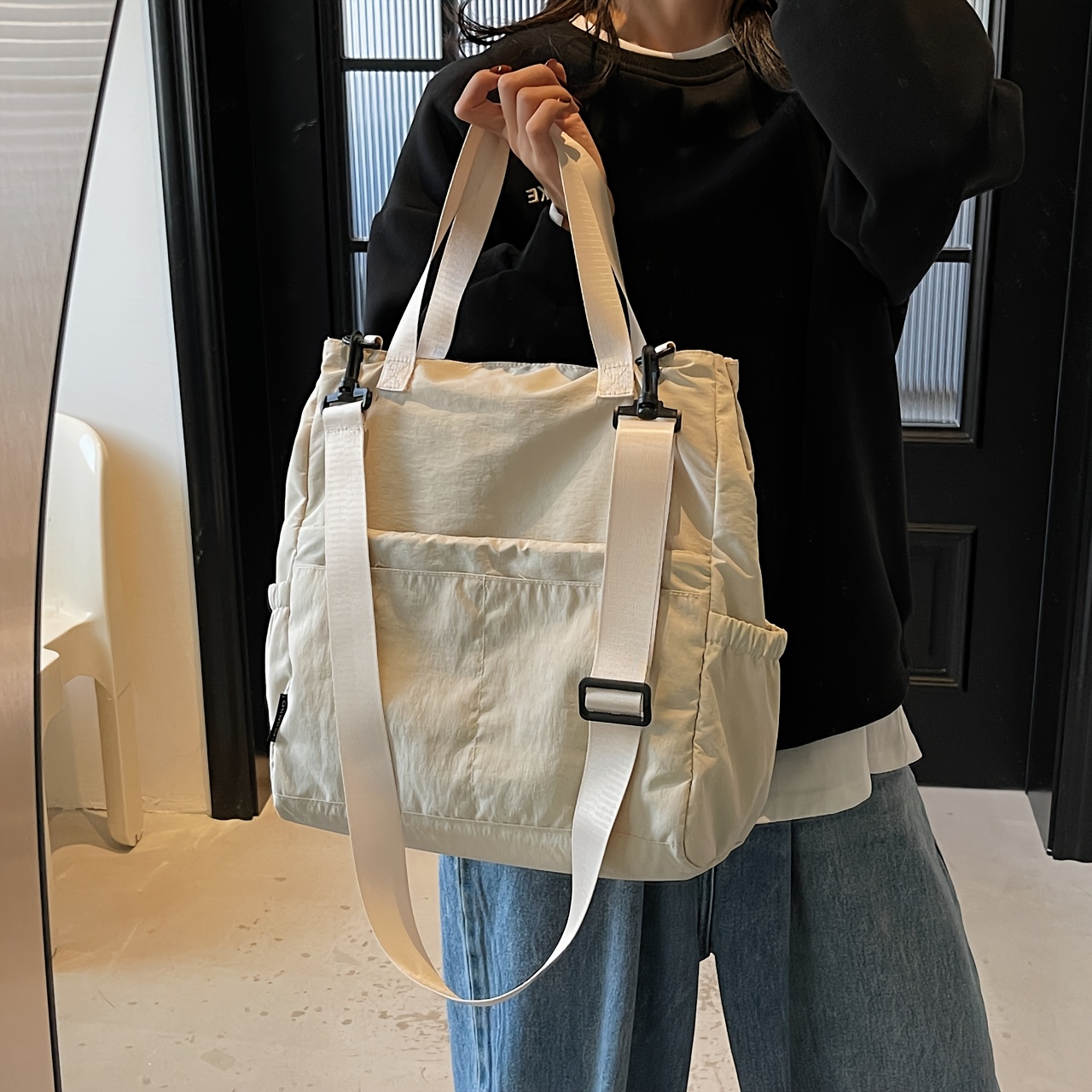 New Women'S Backpack, Double Shoulder Single Shoulder, Large Capacity, Outdoor, Simple Fashion, Zipper, Lightweight, Nylon, Polyester Lining, Removable Strap, Hand Wash, Black Beige Pink Adzuki Bean Color Options